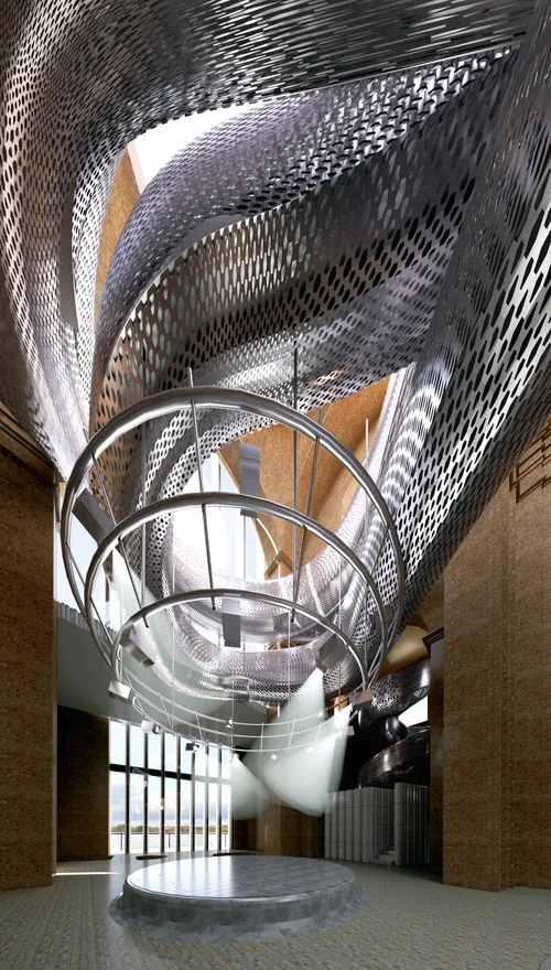 The Hotel is arranged around a central vertical lobby off which all public and rooms array it is orientated to face out onto the water with a number of south facing terraces at different levels providing views out over the whole estate, rooms look onto the water and each has a screened terrace behind the bamboo latticework façade.
